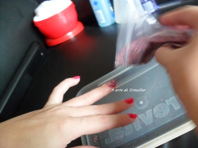 Quando a unha estiver total mente coberta, pressionar de leve com o dedo para o caviar aderir bem a unha.